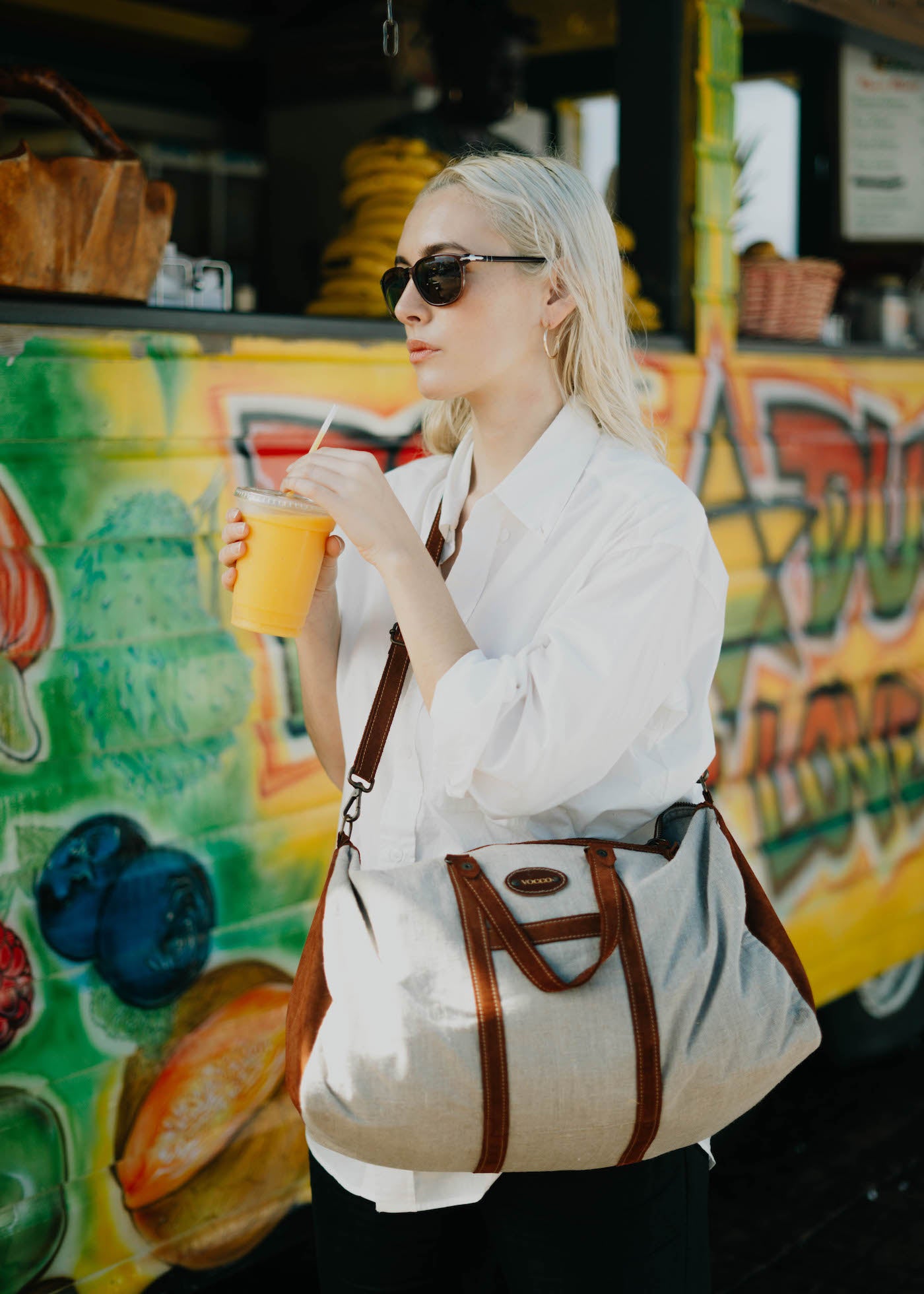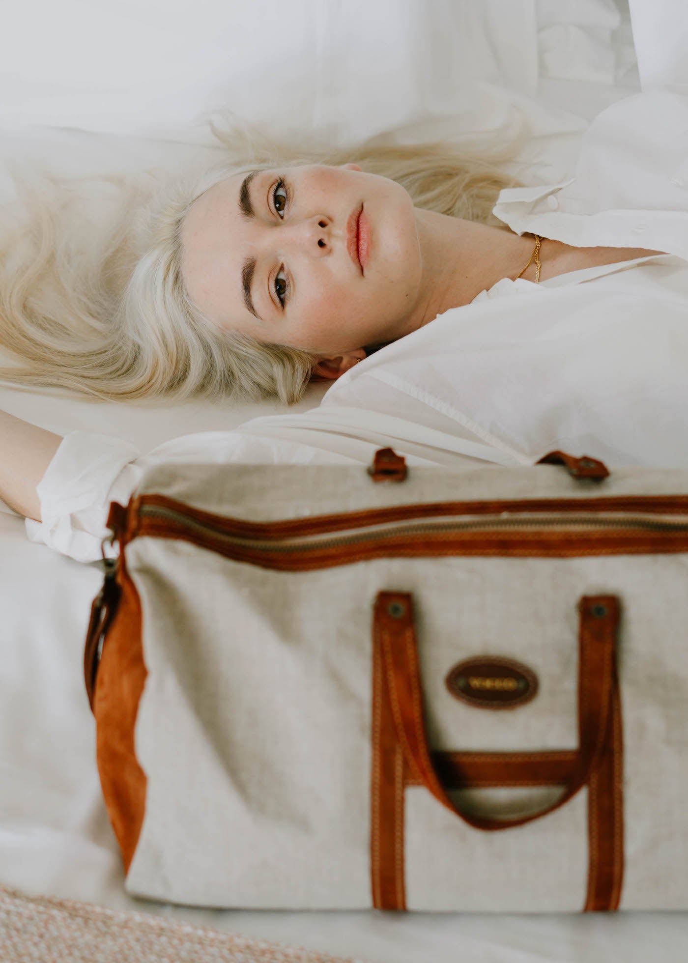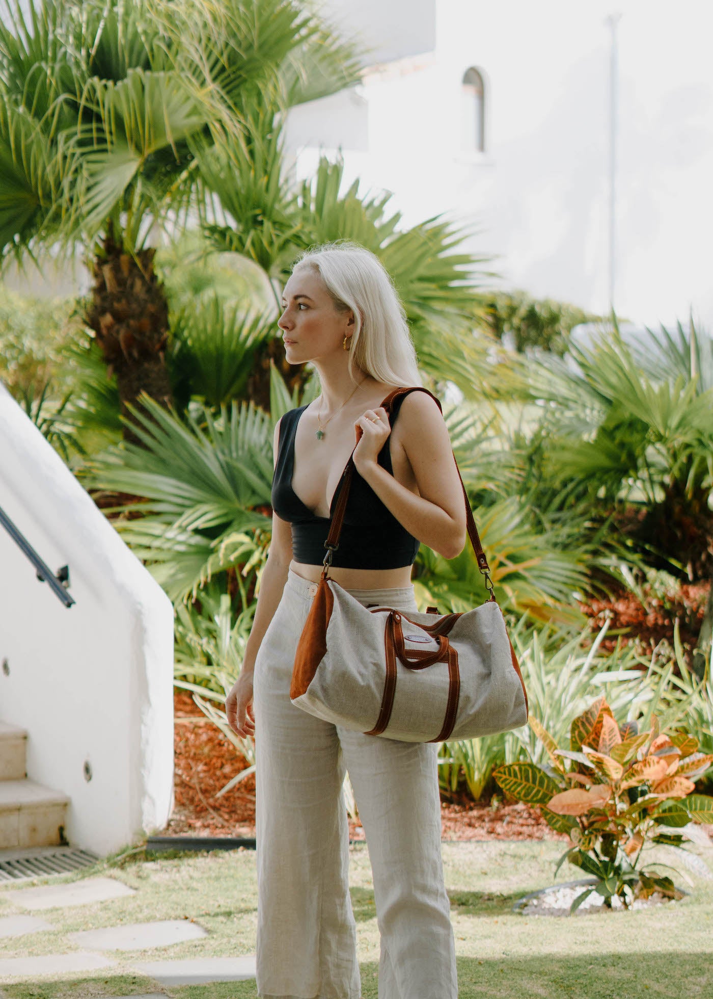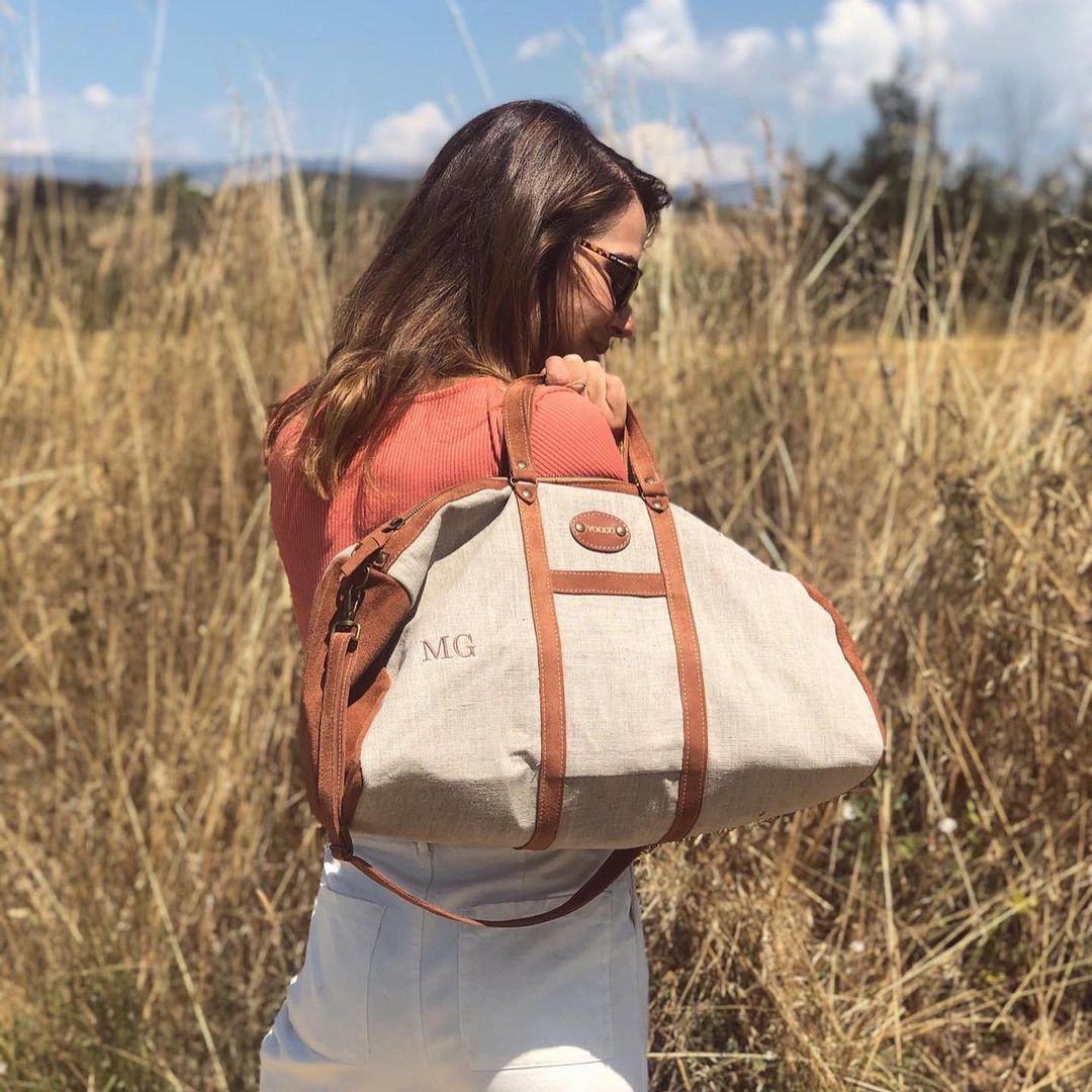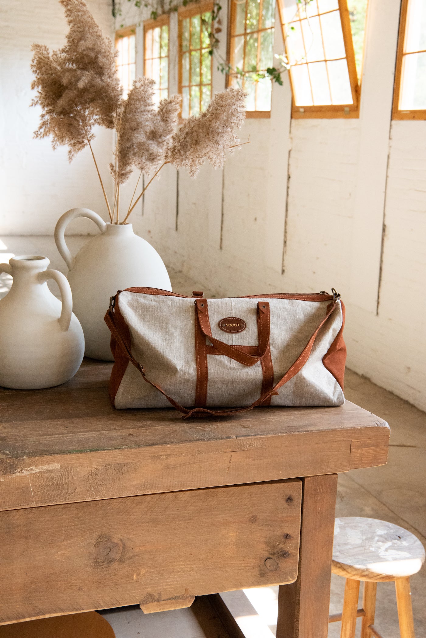 Our timeless curated weekender bag is handcrafted in Spain out of the best quality linen and leather. Vocco's star product is created with a double layer of linen, which has been previously reinforced by our artisans to give the appropriate consistency to endure over time.